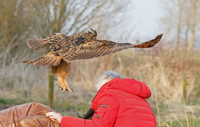 Этот филин сделал маленький городок в Нидерландах знаменитым. Менно Шефер, 48-летний житель Зандама, запечатлел приземление почти трехкилограммовой птицы на голову мужчины в Нордейнде. Однажды филин даже пыталась сесть на голову фотографа, но камера Менно испугала его.