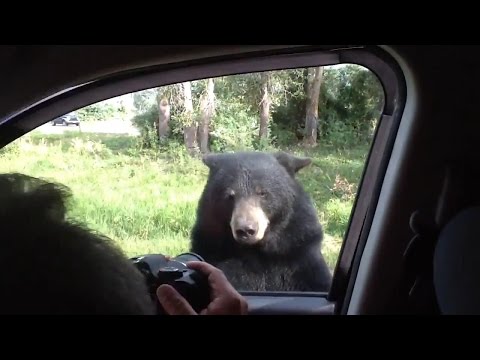 Заметив медведя глава семьи начал бесстрашно снимать его на видеокамеру, за что чуть жестоко не поплатился. Недовольный мишка с легкостью открыл лапой дверцу машины, в которой находились люди.