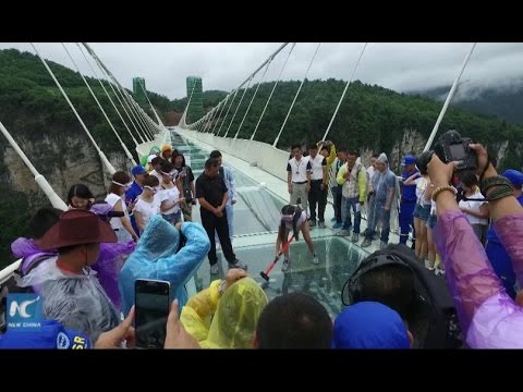 Его построили в национальном парке Чжанцзяцзе. Мост находится в горах на высоте 300 м. Его протяженность 430 м. Для того, чтобы убедить посетителей в его безопасности была проведена рекламная акция, в ходе которой туристам предлагалось разбить кувалдой плиты, из которых сделан мост. Смотрите, что из этого получилось.