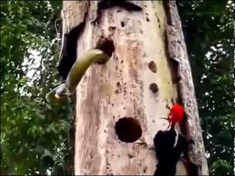 Судя по настойчивости, у дятла там были птенцы, за которыми эта гадина зеленая туда и забралась…