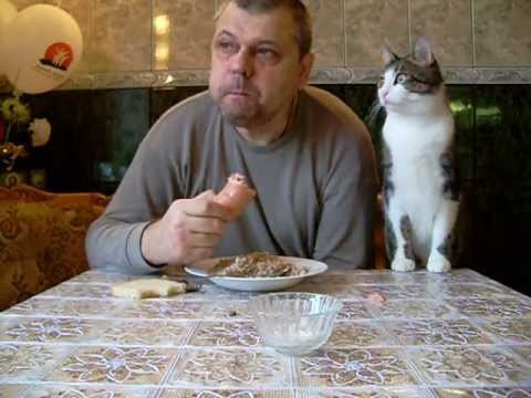 Животное намерено поохотиться на хозяйскую еду. Тактика такова: втереться в доверие, встать задними лапами на табуретку и выжидать наиболее удачный момент.