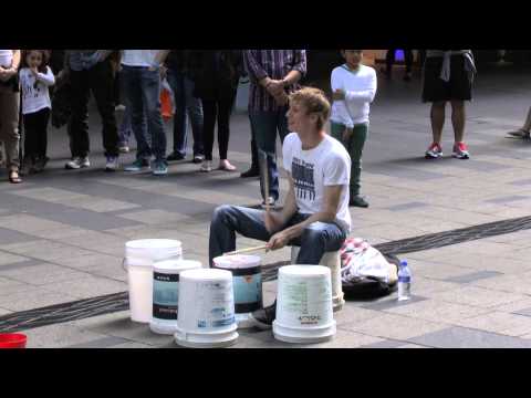 Парень отжигает на ведрах-барабанах в центре Сиднея!