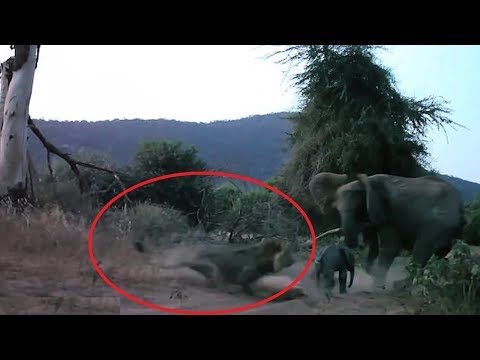 На кадрах видно, как лев кидается к слоненку сзади, однако в этот момент его мать разворачивается и сама идет на хищника, угрожая ему бивнями и издавая мощный рев.