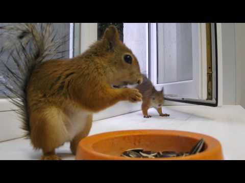 Грызет семечки с удовольствием, не стесняясь с высокой скоростью. Во время трапезы пришел второй бельчонок, но главный герой ролика отстоял свою миску.