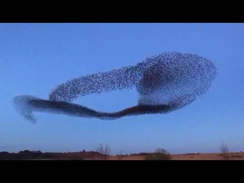 Тысячи птиц сбиваются в громадные стаи, которые динамически формируются в удивительные небесные фигуры, постоянно сжимаясь и разжимаясь.