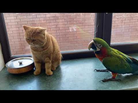 Кот Персик охраняет кастрюлю от попугая Арчи.