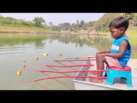 Маленький мальчик рыбачит на фоне красивой природы.