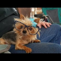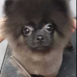 Очаровательный крошечный пёсик танцует под музыку, пока грумер делает ему стрижку.