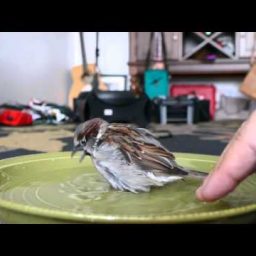 Этого воробья зовут Спарки. Совсем маленьким птенцом он вместе со своими братьями и сестрами выпал из гнезда и был единственным, кто выжил. Сейчас Спарки 2 года. По свидетельству его хозяев, это очень умная птичка, которая абсолютно не боится людей.