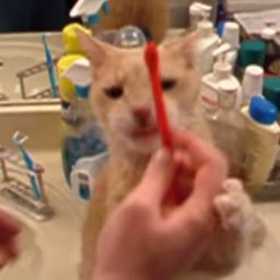 Посмотрите, с каким нетерпением кот ждет, чтобы ему почистили зубы. То ли ему действительно это очень нравится, то ли зубная паста очень вкусная.