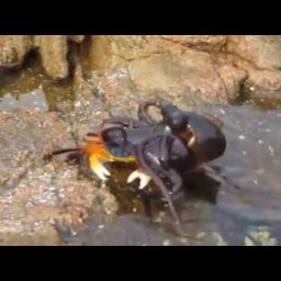 Схватку не на жизнь, а на смерть сняла на камеру мобильного телефона жительница Австралии. Девушка просто прогуливалась по побережью, когда увидела, как осьминог неожиданно выскочил из-под камней и набросился на крупного морского краба.