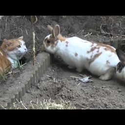 Кролики вырыли яму в саду и кот хочет в ней немного посидеть. Но кролики этого не приемлют!