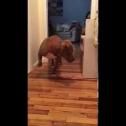 Пес медленно выходит из-за угла. Он постоянно оглядывается и старается казаться маленьким, съеживаясь в холке. Хозяйка зовет его шепотом и подбадривает: «Ну же, иди ко мне, иди сюда!». Крадучись, он проходит поворот, так же медленно и аккуратно ступая.