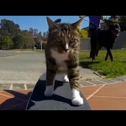 Кошка по кличке Диджу покорила прокатилась по улицам австралийского городка Кулангатта на скейтборде, удивляя прохожих. Катанию на доске с дистанционным управлением кошку научил дрессировщик Роберт Долвет, работающий в кинологическом центре.