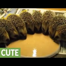 Восемь ежиков с аппетитом едят из одной миски. Никто из них даже не думает отбирать еду у соседа.